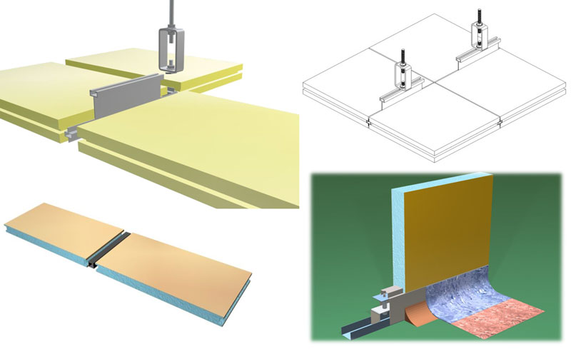板与板之间是内置式铝龙骨或PVC方管连接的,形成一连续自支承结构的墙。两块板之间的接缝处用硅胶密封处理。顶板用M-8螺纹钢筋和支架固定在建筑顶上。